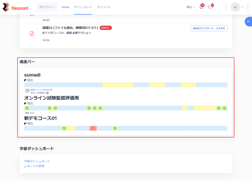 3.「進度バー」のセクションまでスクロールすると、各コース (科目) の活動(課題、小テストなど) の状態を表示