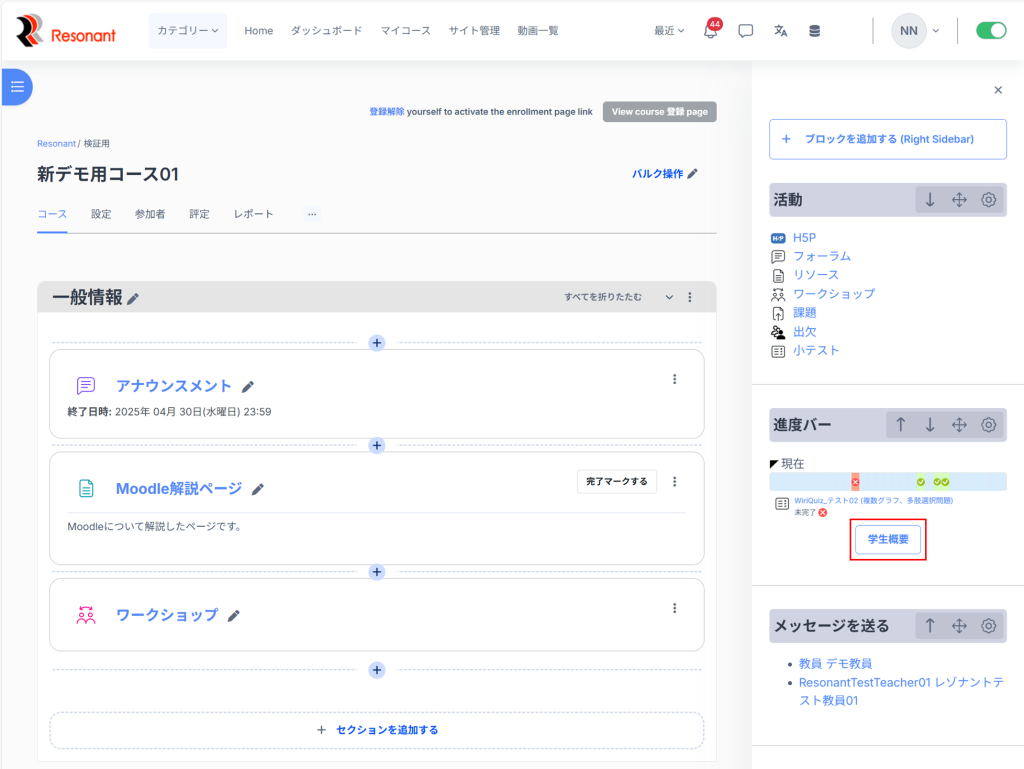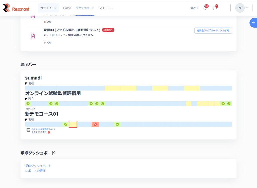 今回はこれらの課題を「見える化」によって解決する、Resonant LMS (MoodleベースのLMS) の標準機能の「進度バー」の使い方を画像付きで解説いたします。