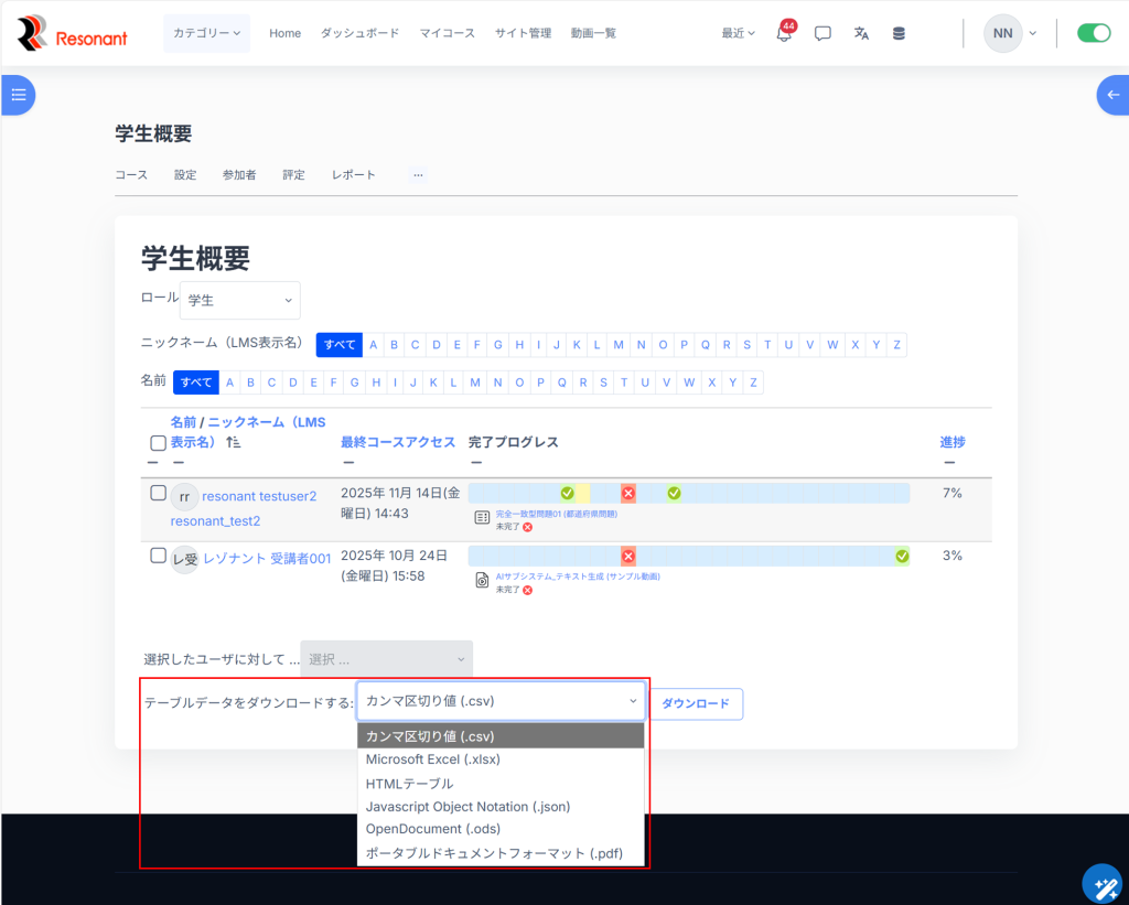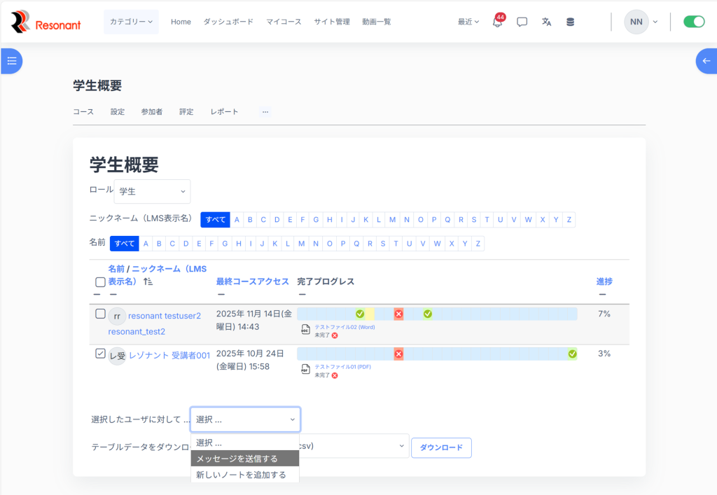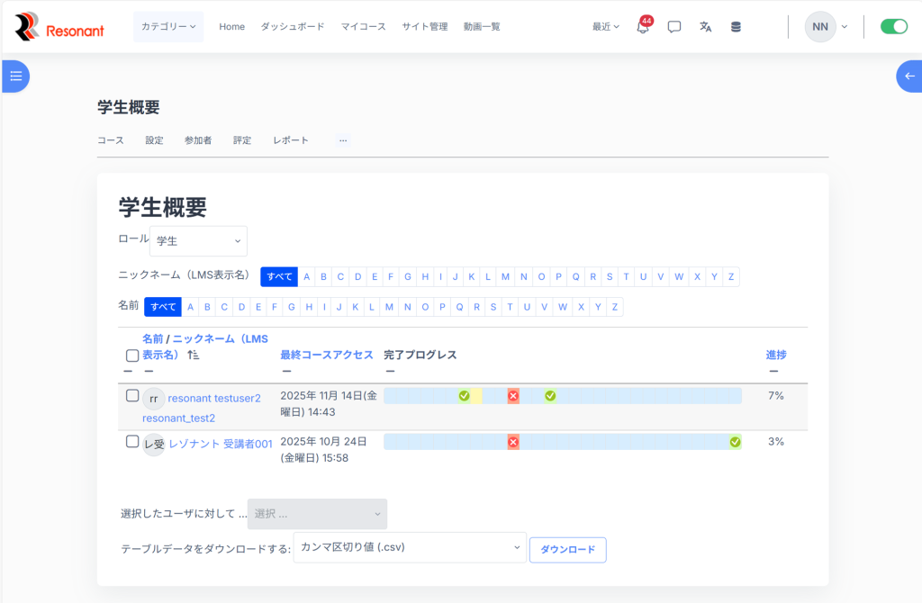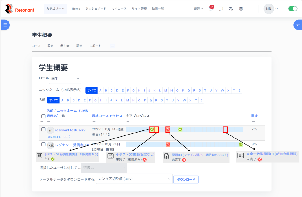 教員や管理者は、各学生の進捗状況を瞬時に把握できます。