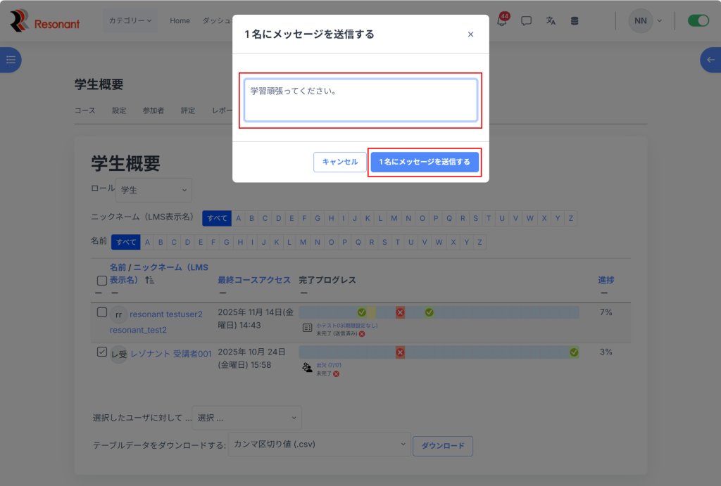 7.学生に個別にメッセージを送りたい場合は該当のユーザーにチェックを入れ、「選択したユーザに対して」で「メッセージを送信する」を選択 (複数のユーザーを選択してメッセージの送信も可能)
