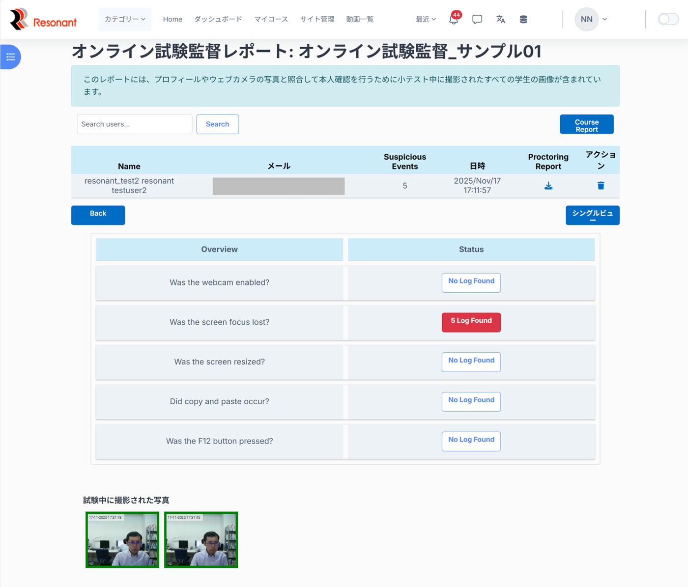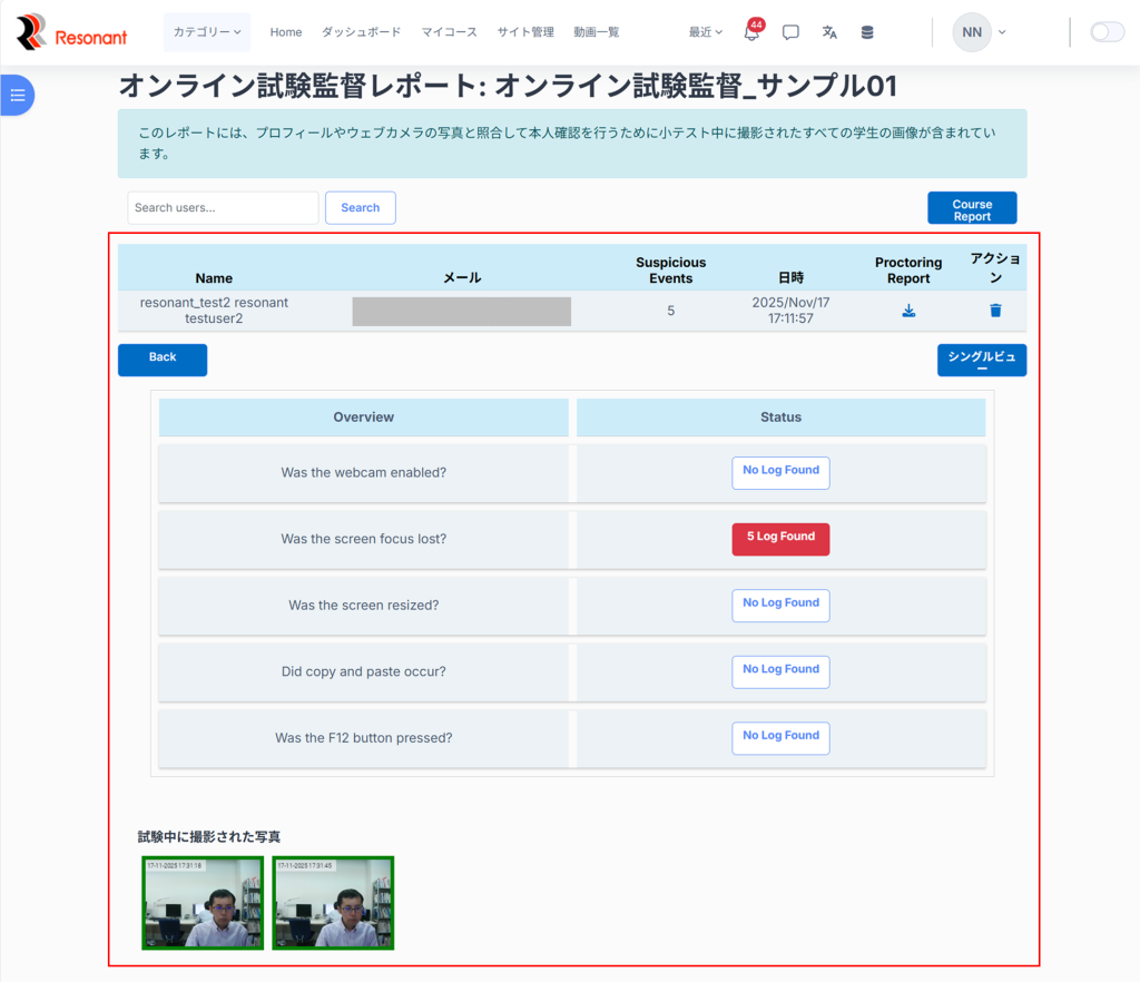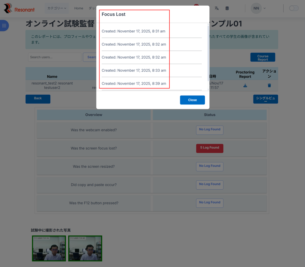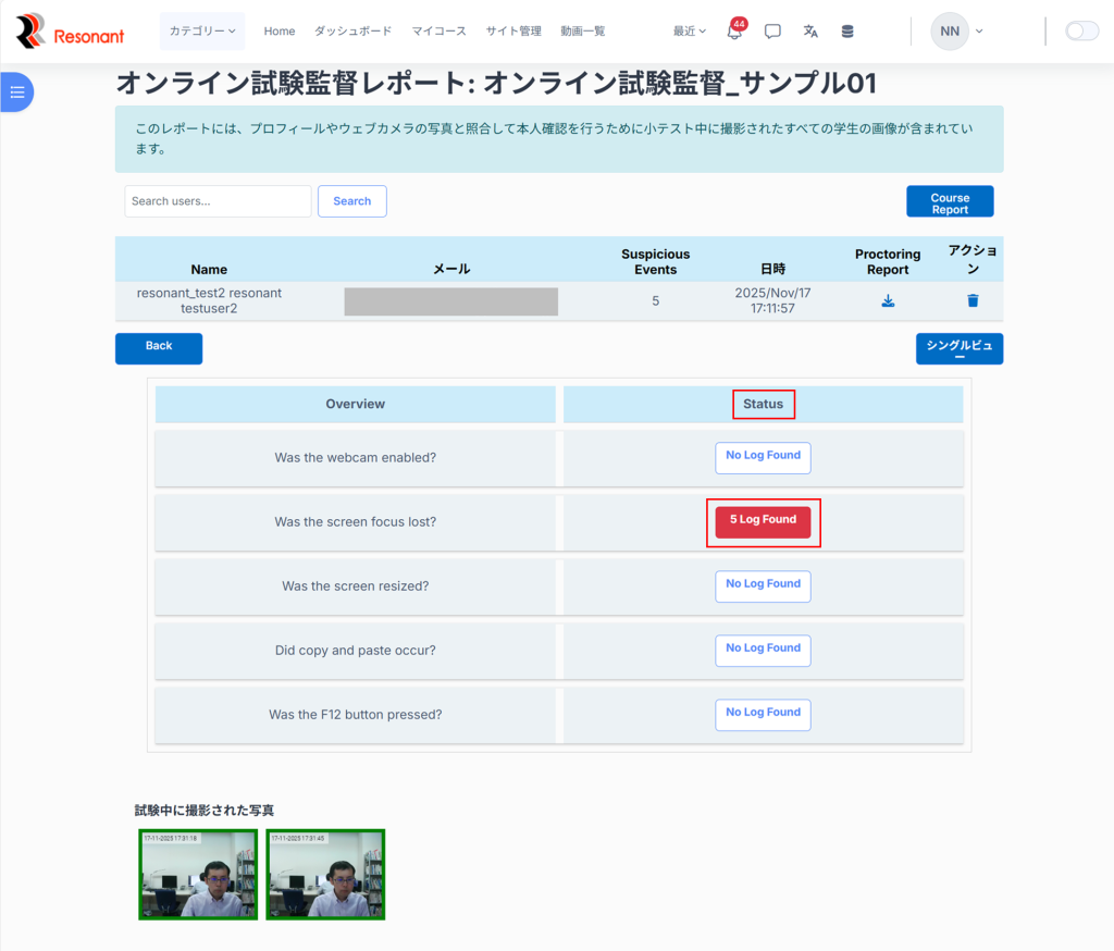8.試験の最中に疑わしい活動が見つかった場合は「Status」のカラムが赤で表示され、クリックするとログが確認可能