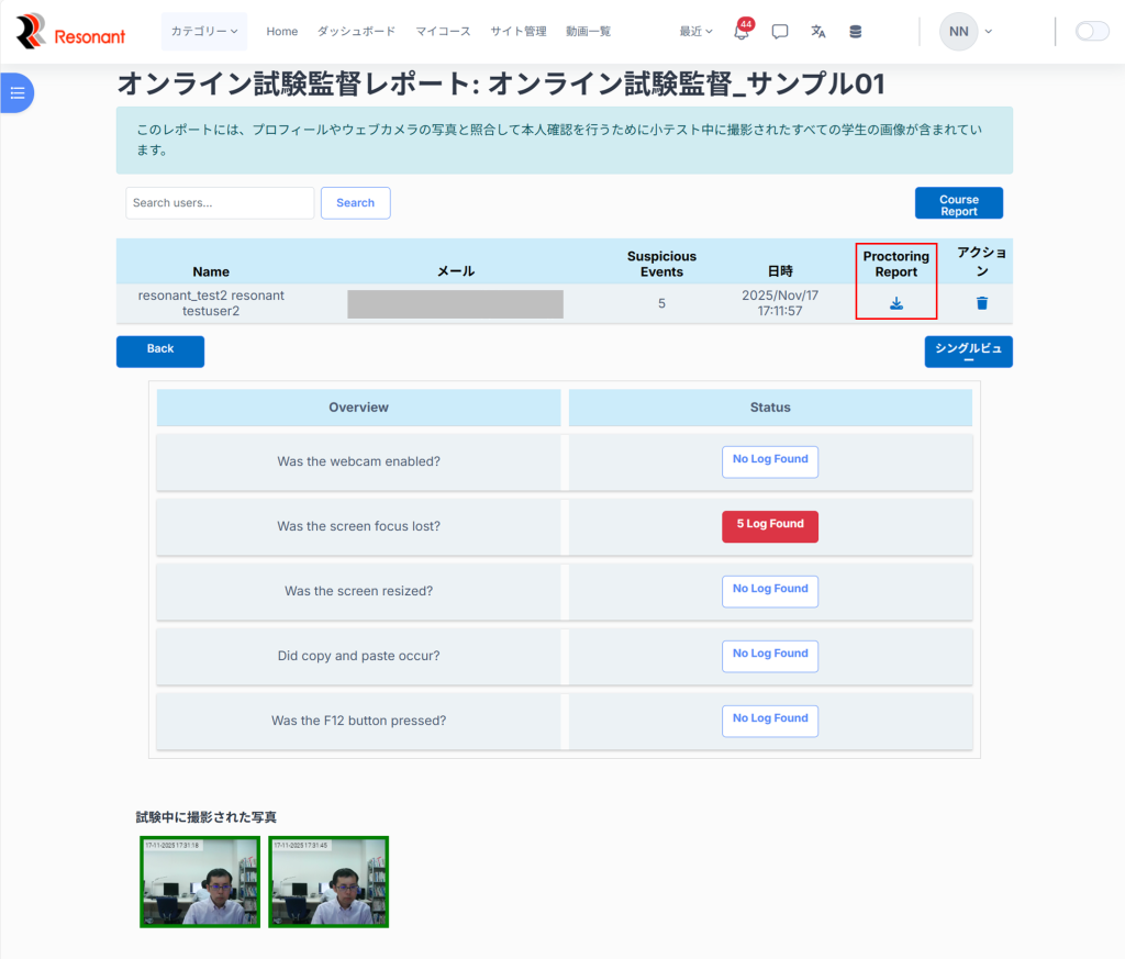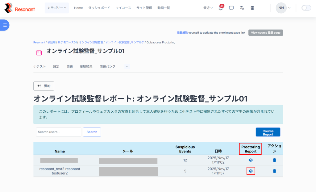 5.該当のユーザーの「Proctoring Report」のカラムの目のアイコンをクリック