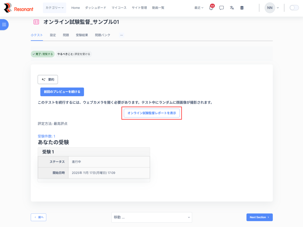 4.「オンライン試験監督レポートを表示」をクリック