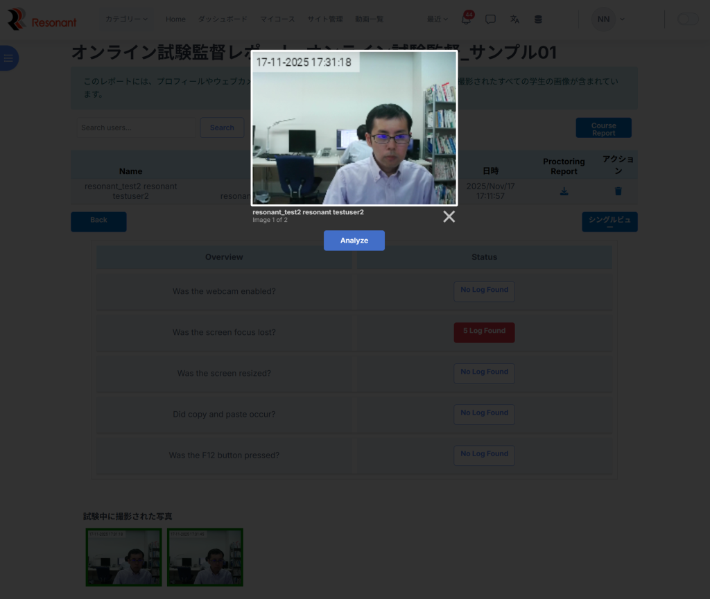 7.写真をクリックし、「Analyze」のボタンをクリックすると、管理者側で事前に登録された写真と本人が一緒か照合が可能 (緑色の枠の場合は本人と一致、赤色の枠の場合は本人と不一致)
